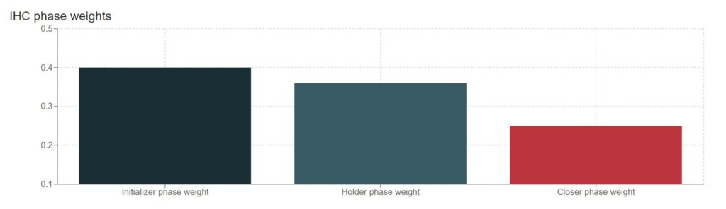 When training your customer journey (CJ) data, you will obtain some insights. One of the main insights are the IHC phase weights, see below chart. The phase weights represent the importance of each phase in the overall buying process. The sum of the three weights is 1.0 (=100%). A high weight can be interpreted such that this phase tends to spread of multiple touch points and a longer period. Whereas a low weight represents that this phase is usually covered with less touch points and needs therefore less attention, hence a lower weight.